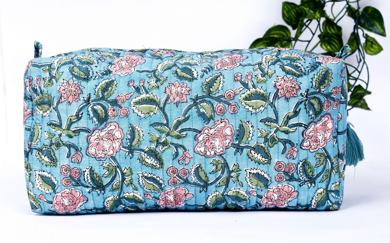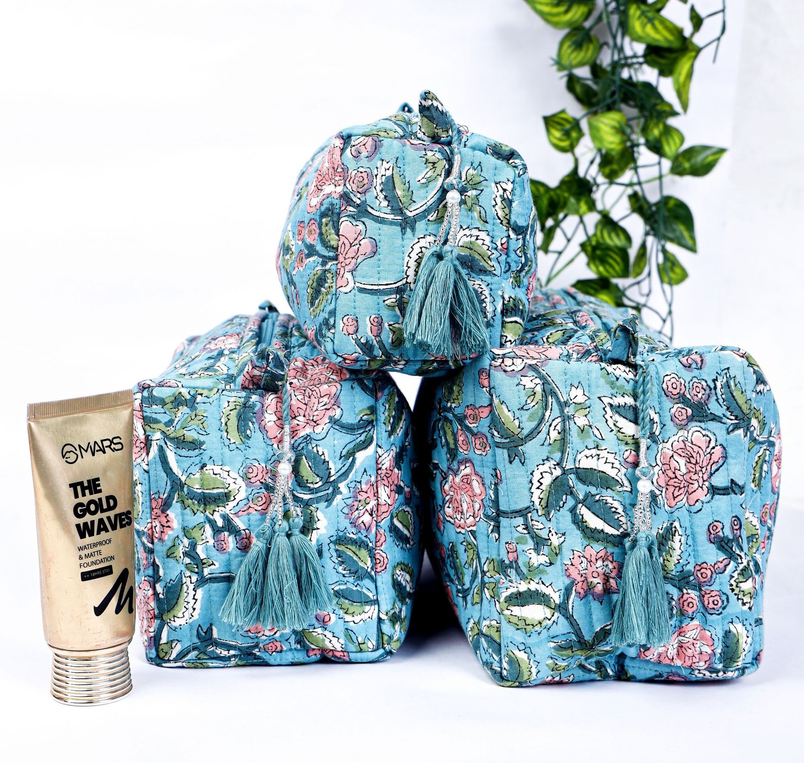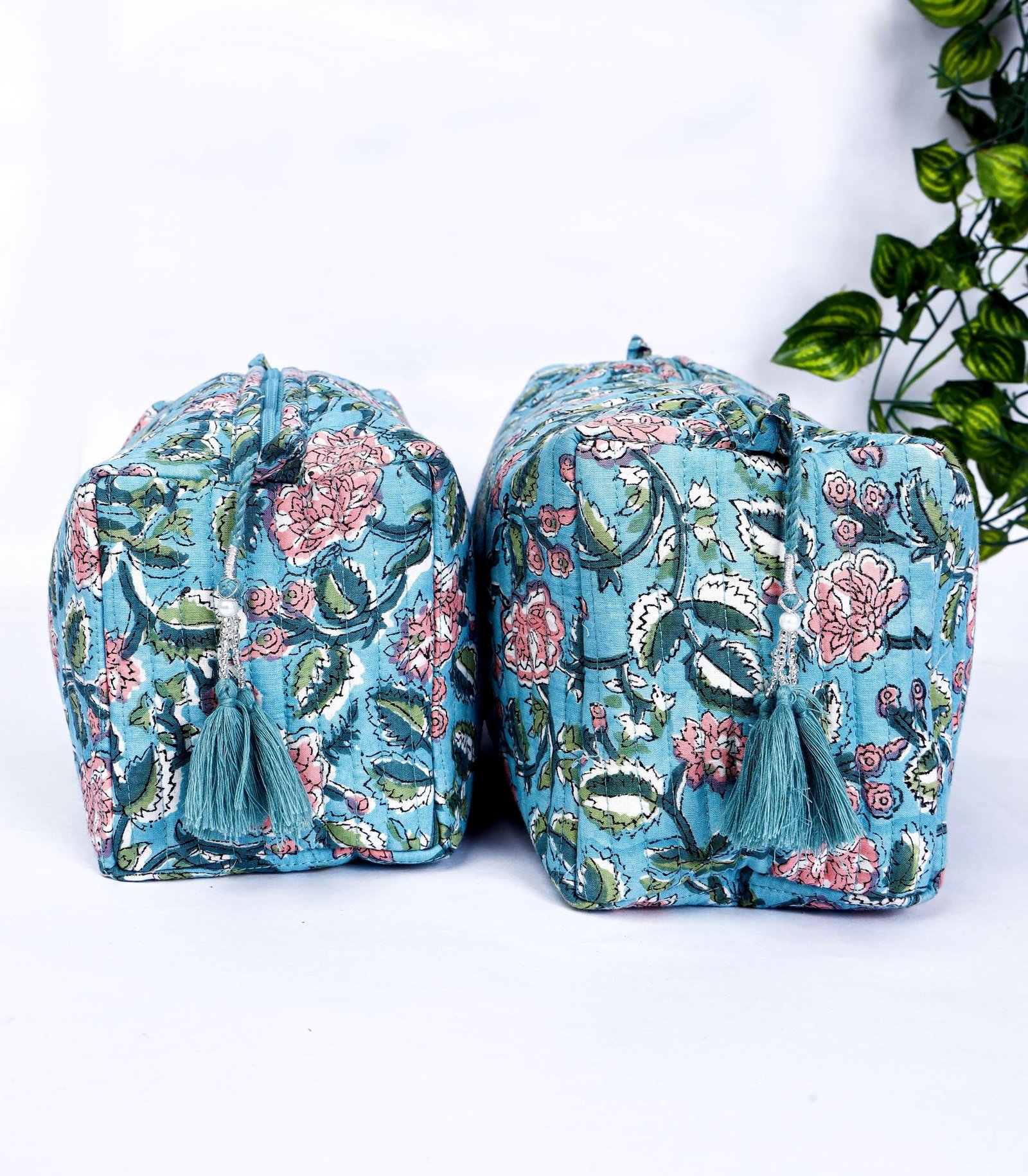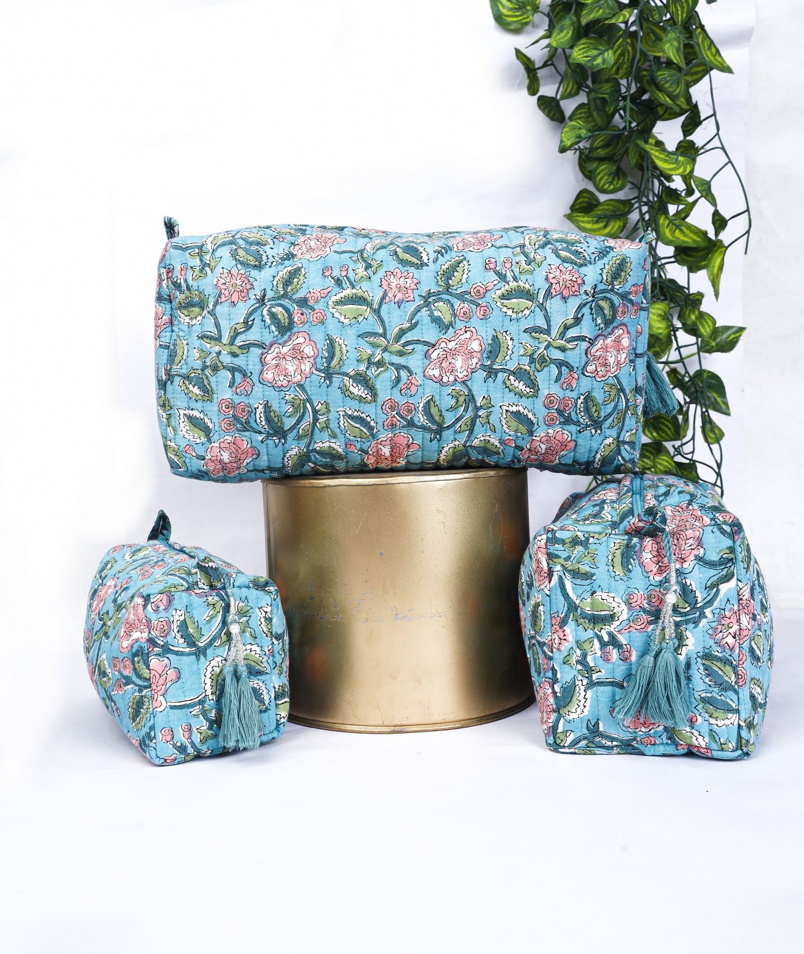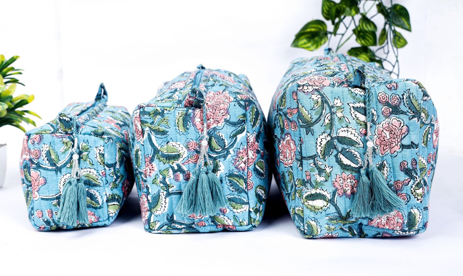 Block Print Toiletry Bags Set | 100% Cotton Quilted Makeup Pouch Trio | Jaipur Handcrafted Travel Case