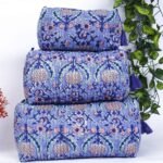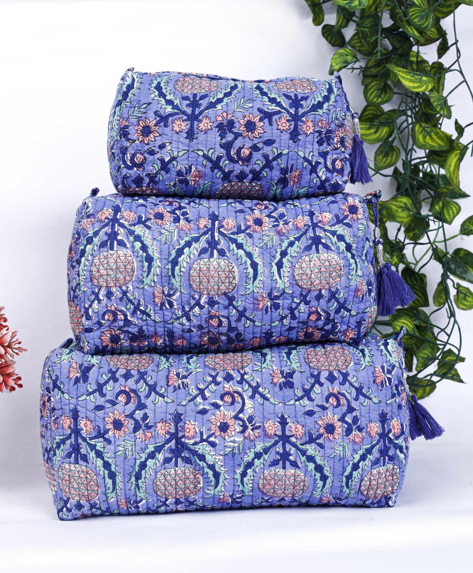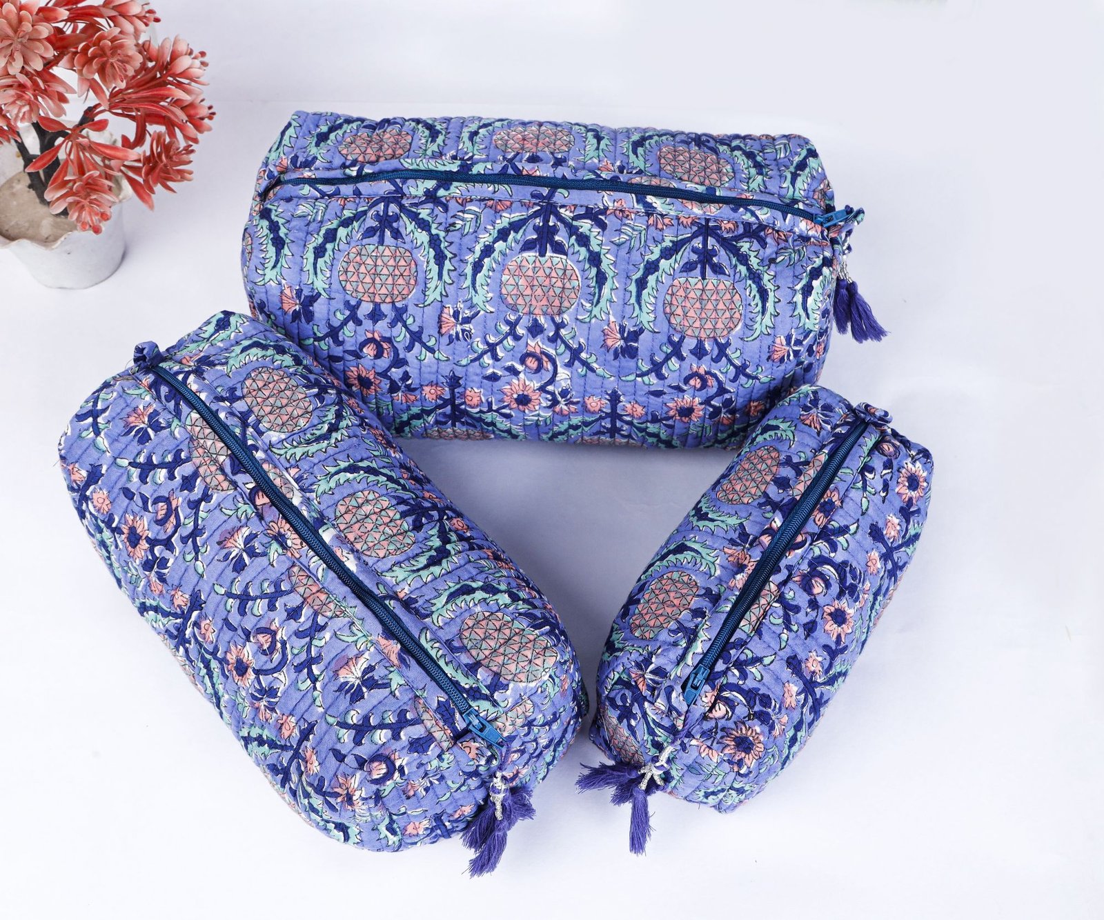 Cotton Travel Pouch Set Handmade Quilted Toiletry Bag Set of 3 Block Print Design