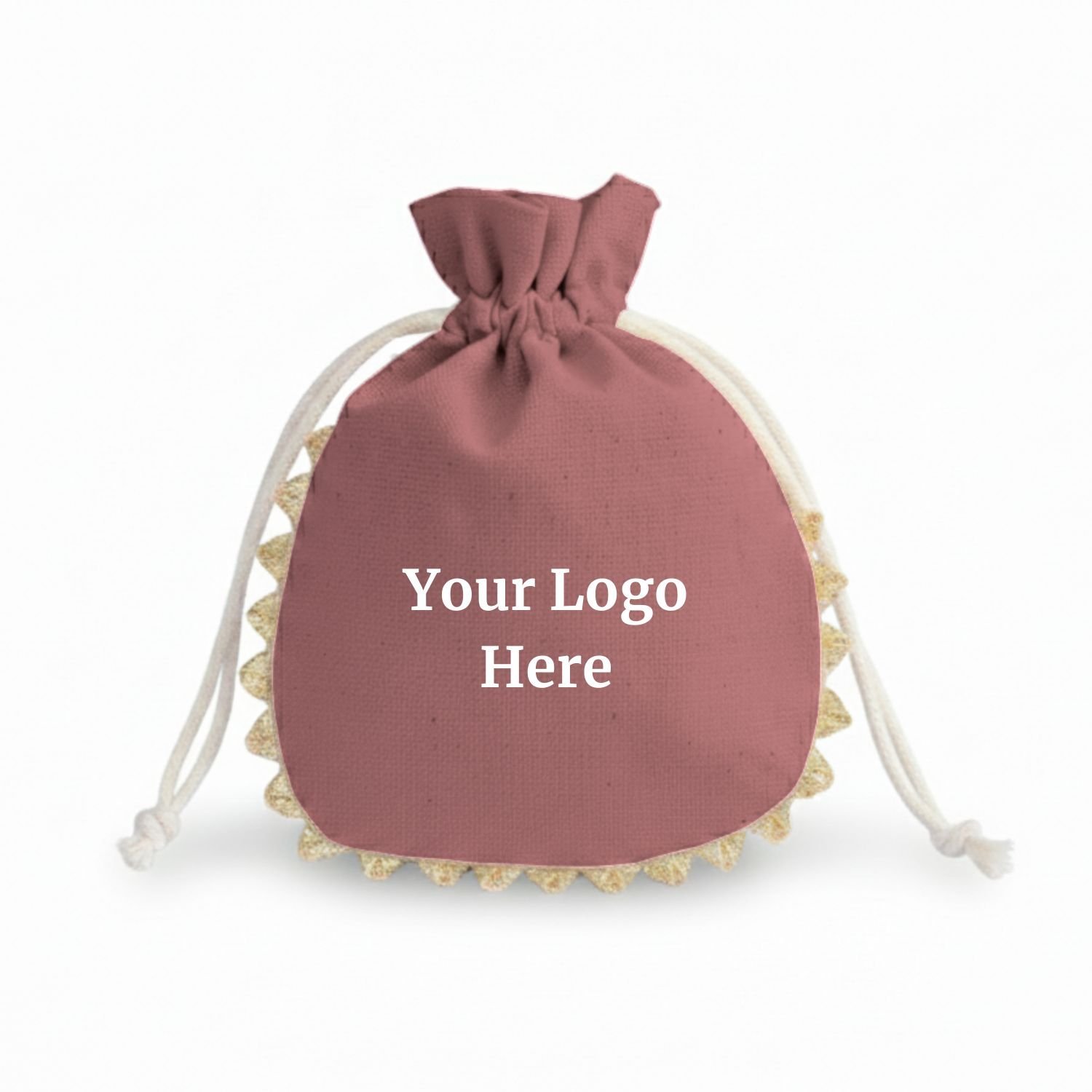 Rose Quartz Cotton Drawstring Pouches with Golden Lace & Custom Logo - 100 Pcs